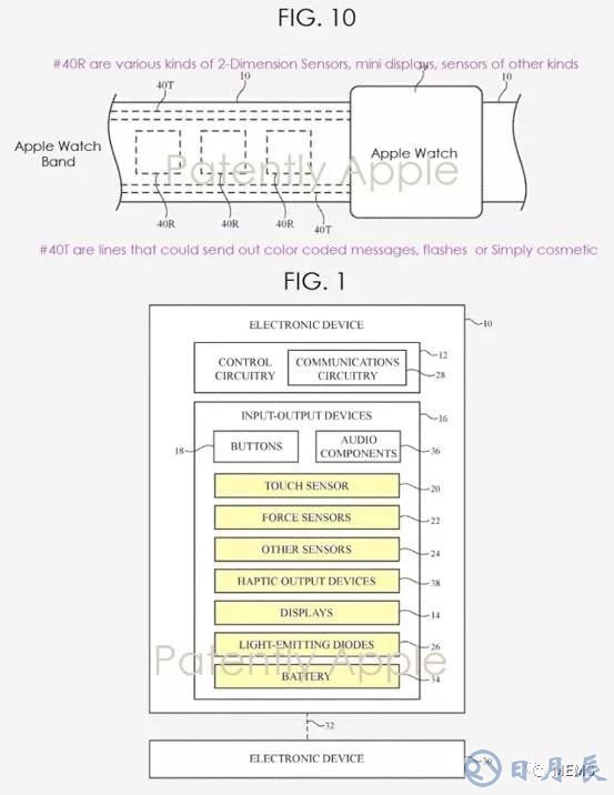 Apple Watch表帶可以包括觸摸傳感器、力傳感器、氣體傳感器、接近傳感器、顆粒傳感器、溫度傳感器、濕度傳感器、光學(xué)傳感器、電容傳感器、電阻傳感器、環(huán)境光傳感器、麥克風(fēng)、攝像頭或其他傳感器。它還可能包括揚(yáng)聲器和觸覺反饋。這件蘋果專利中的圖10(如下圖FIG. 10所示),是具有特征功能的Apple Watch表帶示意圖,其表帶顯示了照明裝飾圖案和附加的照明內(nèi)容。