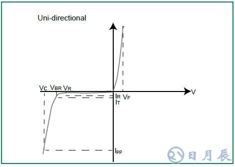 當(dāng)脈沖峰值電流Ipp流過(guò)TVS時(shí),其兩端出現(xiàn)的最大電壓值稱為箝位電壓Vc。Vc和Ipp反映了TVS的浪涌抑制能力。通常把Vc與VBR之比稱為箝位因子(系數(shù)),其值一般在1.2~1.4之間。實(shí)際使用時(shí),應(yīng)使Vc不大于被保護(hù)電路的最大允許安全電壓,否則被保護(hù)器件將面臨被損壞的可能。