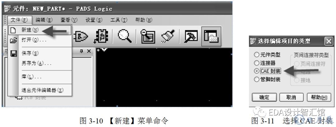 (2)執(zhí)行菜單命令【文件】→【新建】,如圖3-10所示。在彈出的“選擇編輯項(xiàng)目的類型”對(duì)話框中,選擇“CAE封裝”后單擊【確定】按鈕,如圖3-11所示。