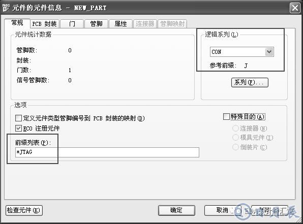 【常規(guī)】標(biāo)簽頁(yè)主要用來(lái)設(shè)置元件類型的全局效果。“邏輯系列”欄用來(lái)選擇相應(yīng)的元件邏輯系列。例如,電容屬于CAP,用C作為參考編號(hào);電阻屬于RES,用R開關(guān)。本例的元件邏輯系列屬于連接器:CON。元件的參考前綴為J。同時(shí)“前綴列表”我們添加上*JTAG。默認(rèn)情況下,勾選“ECO注冊(cè)元件”選項(xiàng),表示此元件是ECO注冊(cè)元件。推薦常規(guī)設(shè)置如圖3-22所示。