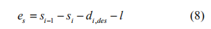 其中 si 代表第i 輛車與慣性參考點(diǎn)的距離,vi 、 ai 分別代表第i 輛車的速度和加速度, l 代表車身的長(zhǎng)度,則第 i 輛車與前車的車間間距誤差為: