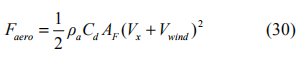 其中 ρa 為空氣質(zhì)量密度,Cd 為空氣阻力系數(shù),AF 為車輛的正面迎風(fēng)面積,Vx 和Vwind 分別為車輛的縱向速度以及風(fēng)速。