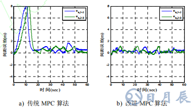 由圖 5 可知,采用傳統(tǒng) MPC 算法的自主車輛雖然能跟蹤上前車的速度,但跟蹤過程中出現(xiàn)超速和較大抖動(dòng),可能導(dǎo)致車隊(duì)的不穩(wěn)定。而采用改進(jìn)MPC 算法時(shí)后面車輛沒有超速行為,跟蹤曲線相對(duì)平滑,隊(duì)列運(yùn)行穩(wěn)定,驗(yàn)證了改進(jìn)算法的有效性。