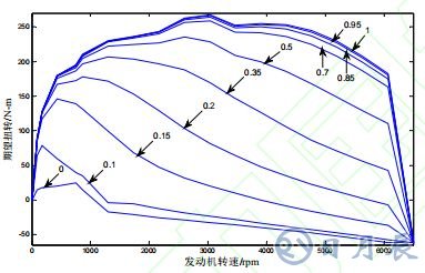 圖 2 為不同油門開度下發(fā)動(dòng)機(jī)轉(zhuǎn)速與扭矩的關(guān)系曲線,其中每條曲線旁邊的數(shù)字對(duì)應(yīng)油門開度。