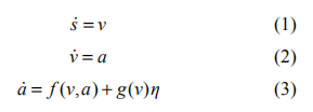 其中 s 為自主車輛相對于慣性參考點的縱向位置, v, a 分別為車輛的速度和加速度,η為發(fā)動機的控制輸入。函數f 和 g 分別為: