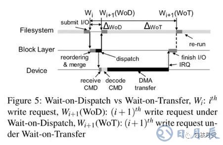 “保序發(fā)送是本文的重要創(chuàng)新之處,上層的文件系統(tǒng)對于需要保序的請求可以帶上barrier標(biāo)志,只要注意在發(fā)送時(shí)不把它們重排序就行,不再需要等待flush。由下邊的存儲設(shè)備來保證帶barrier標(biāo)志請求的持久化順序與它們的發(fā)送順序相同。我們把這種機(jī)制叫做wait-on-dispatch”
