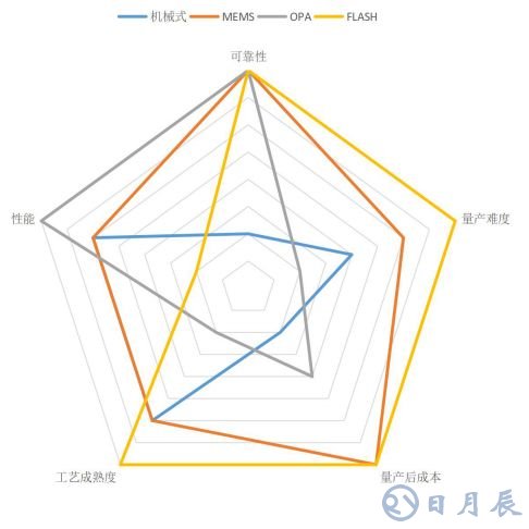 從可靠性、量產(chǎn)難度、量產(chǎn)后成本、工藝成熟度、性能等維度對(duì)機(jī)械式激光雷達(dá)、MEMS激光雷達(dá)、OPA激光雷達(dá)、Flash激光雷達(dá)進(jìn)行對(duì)比如圖。