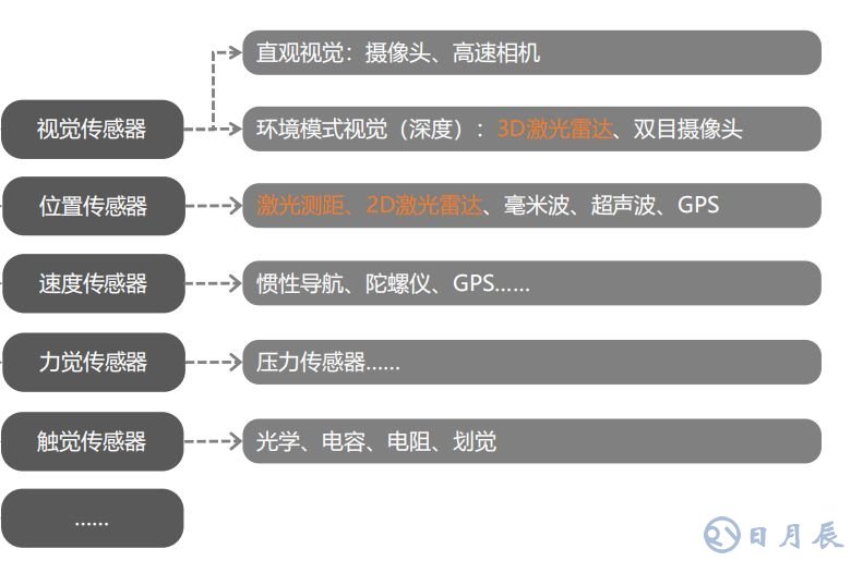 環(huán)境感知相關(guān)的傳感器不止激光雷達(dá)一種,上圖展示了相關(guān)類型,其中應(yīng)用到自動(dòng)駕駛汽車中的傳感器主要有激光雷達(dá)、毫米波雷達(dá)以及攝像頭等。