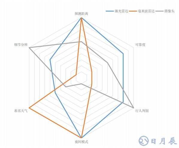 下面從探測(cè)距離、可靠度、行人判別、夜間模式、惡劣天氣、細(xì)節(jié)分辨等維度對(duì)激光雷達(dá)、毫米波雷達(dá)、攝像頭三種傳感器的性能進(jìn)行對(duì)比如下圖。
