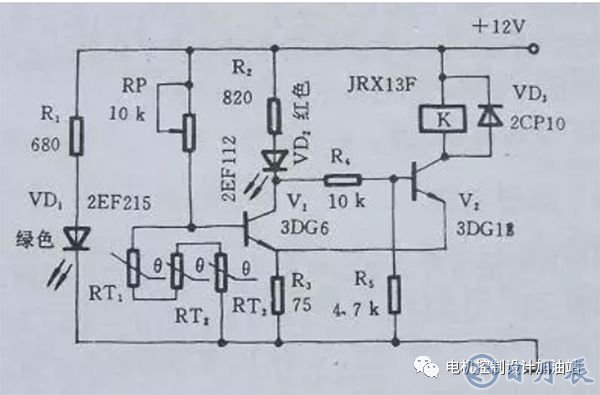 當(dāng)電機(jī)因故障局部過(guò)熱時(shí),只要有一只PTC熱敏電阻受熱超過(guò)預(yù)設(shè)溫度時(shí),其阻值就會(huì)超過(guò)10KΩ以上。 于是V1導(dǎo)通、V2截止,VD2顯示紅色報(bào)警,K失電釋放,電機(jī)停止運(yùn)轉(zhuǎn),達(dá)到保護(hù)目的。