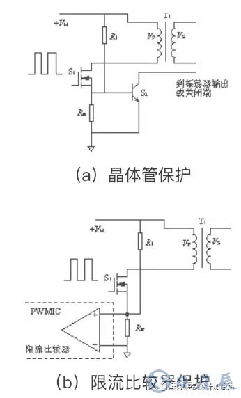 在變壓器初級(jí)直接驅(qū)動(dòng)的電路(如單端正激式變換器或反激式變換器)的設(shè)計(jì)中,實(shí)現(xiàn)限流是比較容易的。圖2是在這樣的電路中實(shí)現(xiàn)限流的兩種方法。