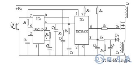 圖6為用555做限流保護(hù)的電路,其工作原理如下:UC384X與S1及T1組成一個(gè)基本的PWM變換器電路。UC384X系列控制IC有兩個(gè)閉環(huán)控制回路,一個(gè)是輸出電壓Vo反饋至誤差放大器,用于同基準(zhǔn)電壓Vref比較之后產(chǎn)生誤差電壓(為了防止誤差放大器的自激現(xiàn)象產(chǎn)生,直接把腳2對(duì)地短接);另一個(gè)是變壓器初級(jí)電感中的電流在T2次級(jí)檢測(cè)到的電流值在R8及C7上的電壓,與誤差電壓進(jìn)行比較后產(chǎn)生調(diào)制脈沖的脈沖信號(hào)。