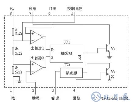 555時(shí)基電路由分壓器R1、R2、R3,兩個(gè)比較器,R-S觸發(fā)器以及兩個(gè)晶體管等組成,電路在5~18V范圍內(nèi)均能工作。分壓器提供偏壓給比較器1 的反相輸入端,電壓為2Vcc/3,提供給比較器2的同相輸入端電壓為Vcc/3,比較器的另兩個(gè)輸入端腳2、腳6分別為觸發(fā)和門限,比較器輸出控制R- S觸發(fā)器,觸發(fā)器輸出供給輸出級(jí)以及晶體管V1的基極。當(dāng)觸發(fā)器輸出置高時(shí),V1導(dǎo)通,接通腳7的放電電路;當(dāng)觸發(fā)器輸出為低時(shí),V1截止,輸出級(jí)提供一 個(gè)低的輸出阻抗,并且將觸發(fā)器輸出脈沖反相。當(dāng)觸發(fā)器輸出置高時(shí),腳3輸出的電壓為低電平,觸發(fā)器輸出為低時(shí),腳3輸出的電壓為高電平。輸出級(jí)能夠提供的 最大電流為200mA,晶體管V2是PNP管,它的發(fā)射極接內(nèi)部基準(zhǔn)電壓Vr,Vr的取值總是小于電源電壓Vcc,因此,若將V2的基極(腳4 復(fù)位)接到Vcc上,V2的基—射極為反偏,晶體管V2截止。