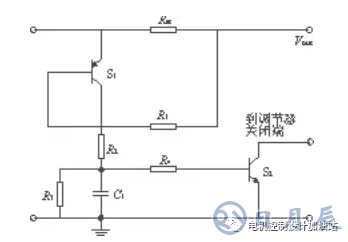 電路正常工作時(shí),負(fù)載電流IL流過(guò)電阻Rsc產(chǎn)生的壓降不足以使S1導(dǎo)通,由于S1在截止時(shí)IC1=0, 電容器C1處于未充電狀態(tài),因此晶體管S2也截止。如果負(fù)載側(cè)電流增加,使IL達(dá)到一個(gè)設(shè)定的值,使得ILRsc=Vbe1+I(xiàn)b1R1,則S1導(dǎo)通,使 電容器C1充電,其充電時(shí)間常數(shù)τ= R2C1,C1上充滿電荷后的電壓是VC1=Ib2R4+Vbe2。在電路檢測(cè)到有過(guò)流發(fā)生時(shí),為使電容器C1能夠快速放電,應(yīng)當(dāng)選擇R4。