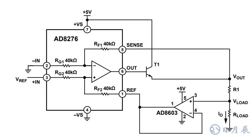 如圖是差動放大器(AD8276)和運(yùn)算放大器(AD8603)構(gòu)成的高精度低成本的電流源電路。