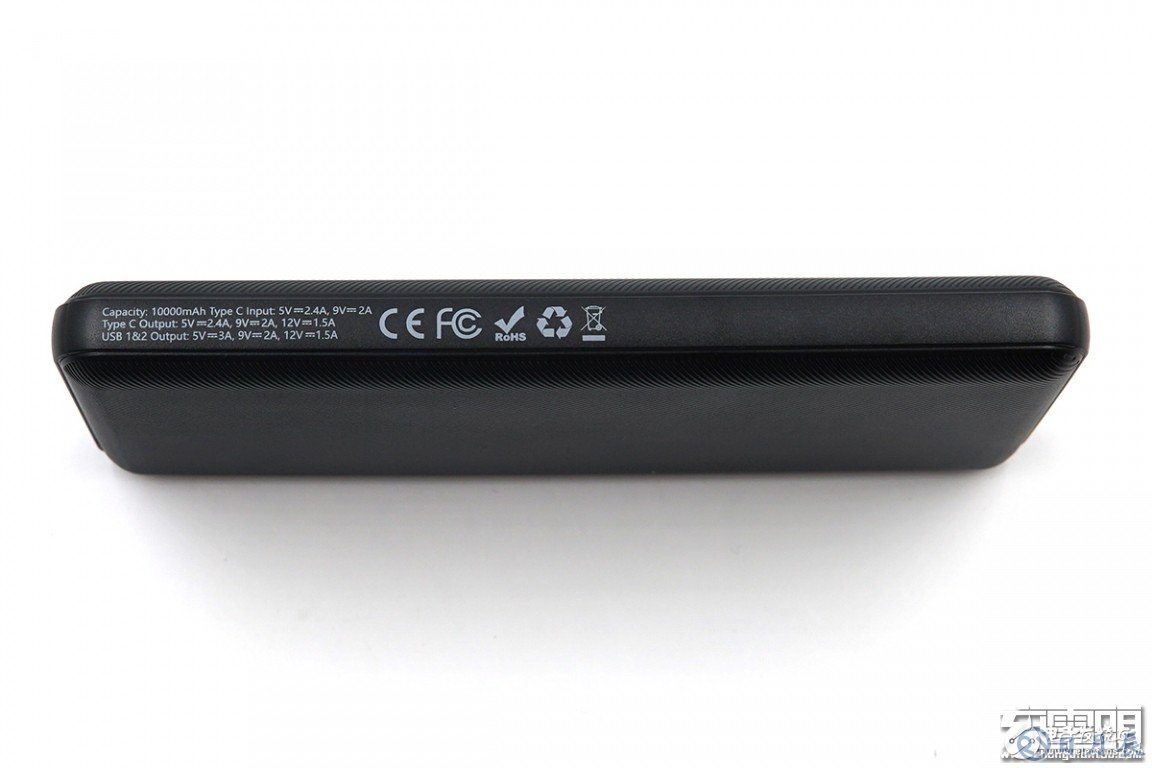 另外一側(cè)是銘牌參數(shù)部分,容量:10000mAh、Type-C輸入:5V2.4A / 9V2A、Type-C輸出:5V2.4A / 9V2A / 12V1.5A、USB1&2輸出:5V3A / 9V2A / 12V1.5A,帶有CE、FC、RoHS等認證標(biāo)志。