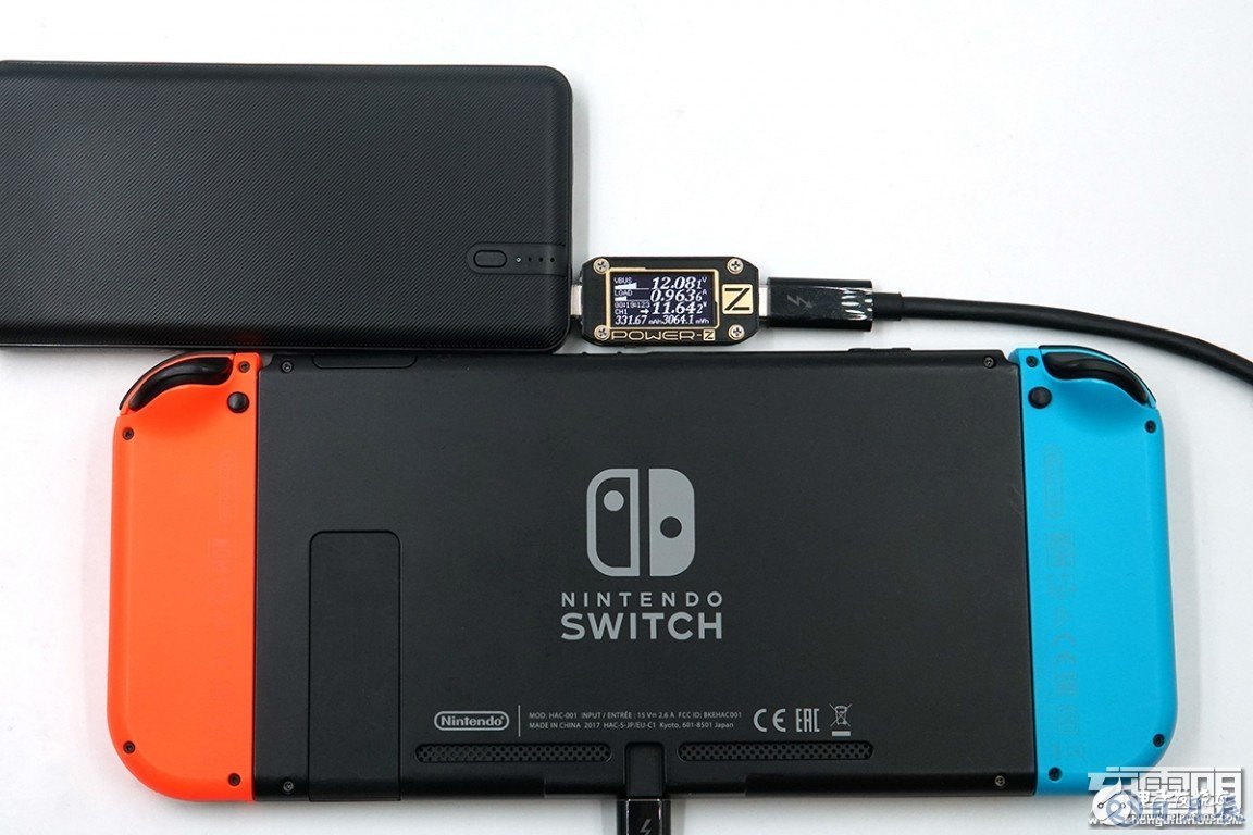 充任天堂SWITCH游戲機,剩余電量15%,電壓為12.08V,電流為0.96A,功率為11.64W,支持USB PD充電。