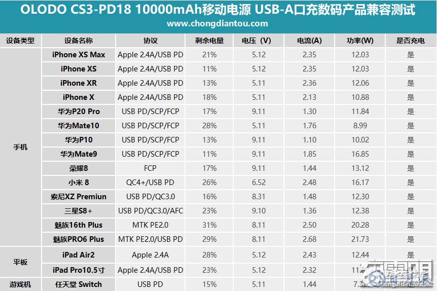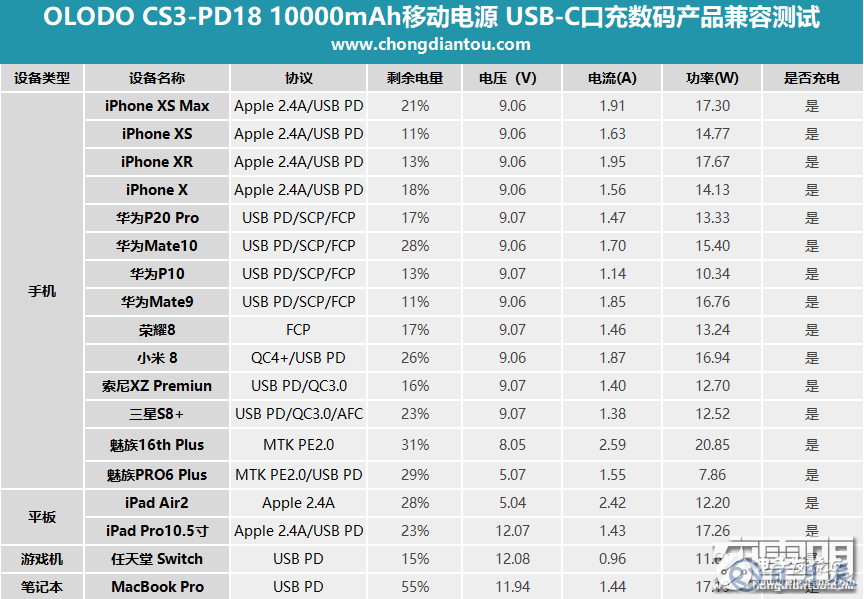 OLODO CS3-PD18移動電源帶有3個輸出口,均支持快充,我們來測試一下對各數(shù)碼產(chǎn)品的兼容性。