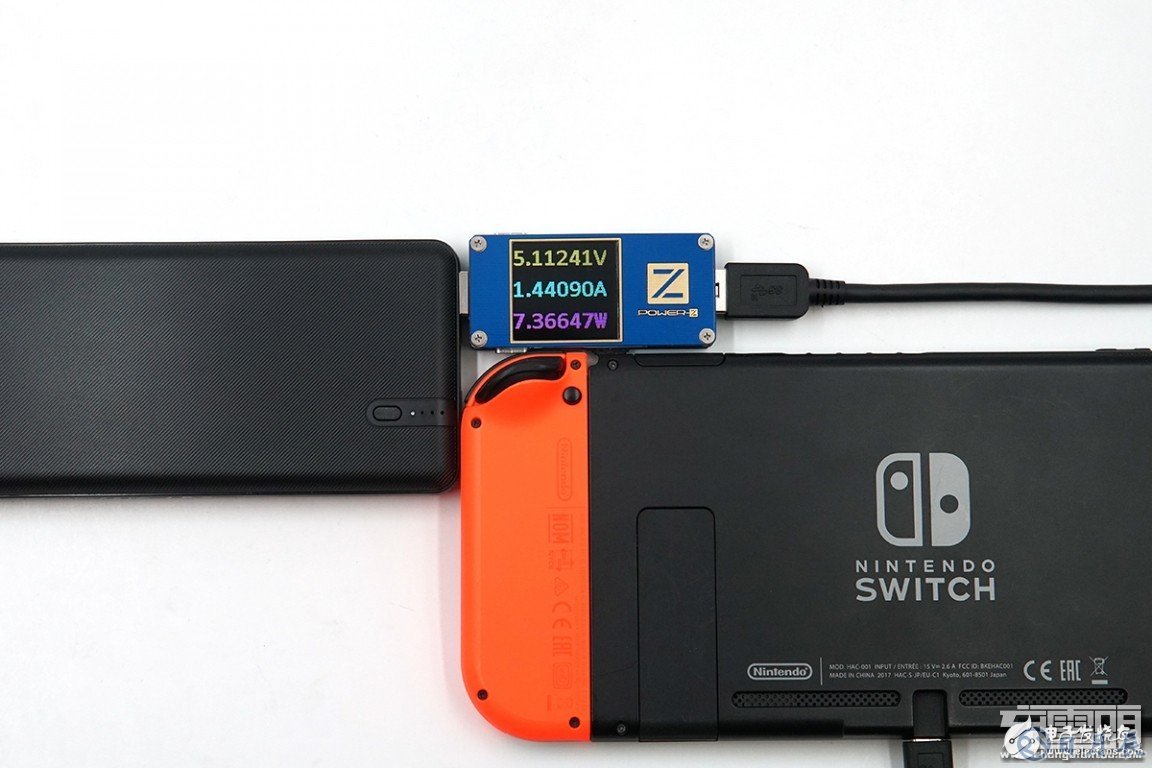 充任天堂SWITCH游戲機,剩余電量15%,電壓為5.11V,電流為1.44A,功率為7.36W,支持USB DCP充電協(xié)議。