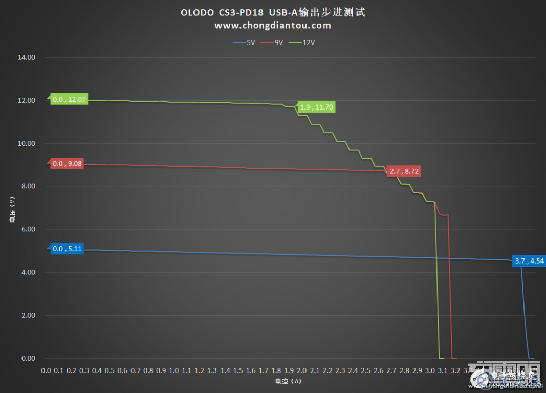 我們使用EBD-USB測量OLODO USB-C接口在各電壓檔位下的輸出能力,將電壓固定在5V、9V、12V,從0開始電流每次增加0.1A直至斷開輸出,記錄每一時刻的電壓電流,制作成表格如下: