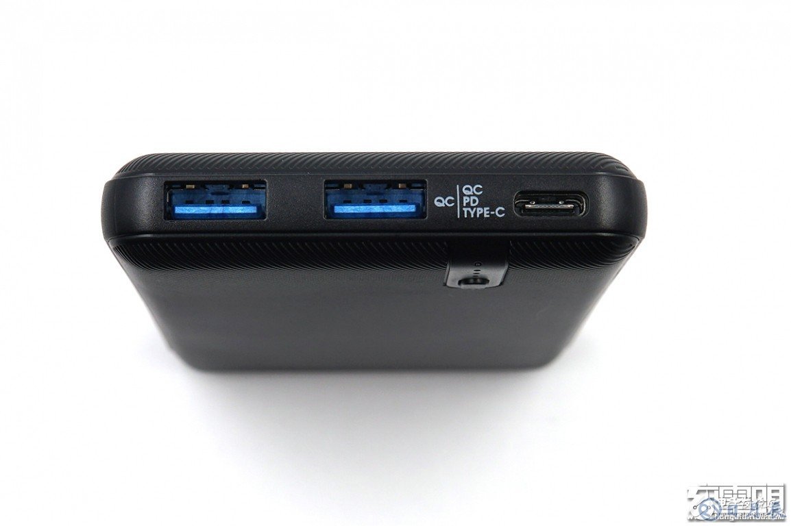 3個USB接口全部集中在了頂部。左側(cè)兩個USB-A輸出接口的膠舌呈藍色,表明這兩個USB-A接口是快充接口,右側(cè)的USB-C接口同時支持輸入和輸出。旁邊的QC、PD字樣注明了每種接口支持快充協(xié)議。