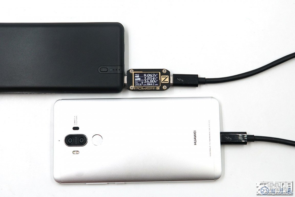 充華為Mate9,剩余電量11%,電壓為9.06V,電流為1.85A,功率為16.80W,支持USB PD充電。