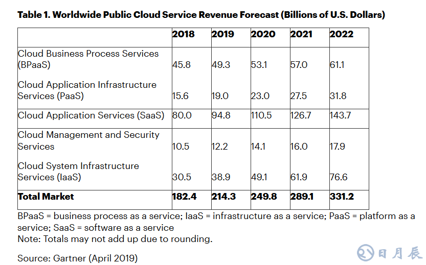 增長最快的分支市場是云系統(tǒng)基礎(chǔ)設(shè)施服務(wù)或基礎(chǔ)設(shè)施即服務(wù)(IaaS),預(yù)計2019年將增長27.5%,達到389億美元,高于2018年的305億美元(見表1)。云應(yīng)用基礎(chǔ)設(shè)施服務(wù)或平臺即服務(wù)(PaaS)將實現(xiàn)21.8%的增長率。
