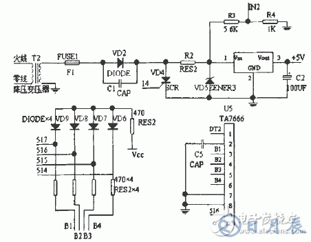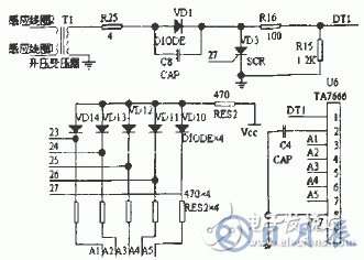 負(fù)載短路時(shí)。電線電流變得很大,使磁感線圈上產(chǎn)生的感應(yīng)電壓升得很高,這時(shí)。磁感線圈獲得的電壓遠(yuǎn)遠(yuǎn)大于0.15V,TA7666的3、4、5、6、7腳同時(shí)輸出低電平,控制過(guò)程與前述相同,電磁開關(guān)立即切斷電源。保證用電戶電器設(shè)備的安全。3.3 超壓保護(hù)電路工作原理