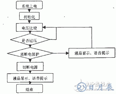 當(dāng)干線電壓過(guò)高時(shí),變壓器T2輸出的電壓超過(guò)5V,經(jīng)整流濾波后加至TA7666。使3腳輸出高電平。由PC3輸入8255,8255得劍干線電壓過(guò)高信號(hào)。從字符存儲(chǔ)器中調(diào)出原來(lái)存儲(chǔ)的電壓過(guò)高的寧信息。由PA0~PA7輸出到HD44780字符液晶顯示模塊。于是。HD44780字符液晶顯示模塊開始顯示電壓過(guò)高。不安全的語(yǔ)句。同時(shí),8255也從存儲(chǔ)器中調(diào)出干線電壓過(guò)高的語(yǔ)音信息。由PB0.PB7輸出送到ISD2650語(yǔ)音芯片,此時(shí)ISD2650語(yǔ)音芯片驅(qū)動(dòng)揚(yáng)聲器發(fā)出5句電壓過(guò)高。不安全”的報(bào)警聲音。提示用戶注意用電的安全。但這只足提示,不切斷電。當(dāng)干線電壓超過(guò)270V時(shí),變壓器次級(jí)輸出為5.6V,這時(shí)TA7666的5腳。由原來(lái)高電乎變?yōu)榈碗娖?。這時(shí)除字符和語(yǔ)音提示外。同時(shí)?;蜷T電路也輸出切斷電源的控制信號(hào),由電磁開關(guān)切斷干線電流。