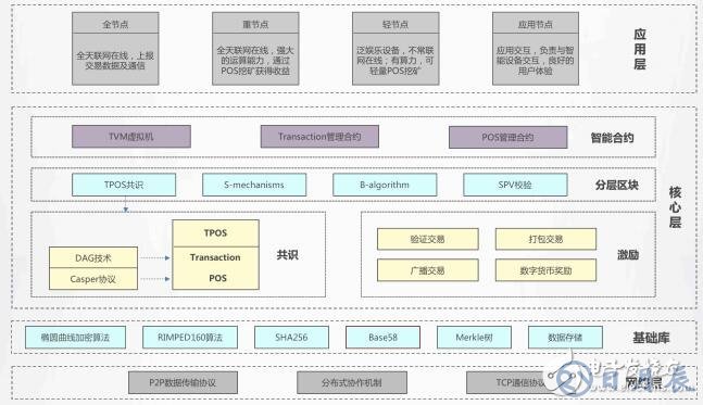 TOS的分層區(qū)塊設(shè)計,先把區(qū)塊鏈里面所有區(qū)塊由鏈拓?fù)涑蒁AG區(qū)塊網(wǎng)絡(luò)結(jié)構(gòu),再由DAG區(qū)塊網(wǎng)絡(luò)分層為無數(shù)層的DAG區(qū)塊網(wǎng)絡(luò),每一層的DAG區(qū)塊網(wǎng)絡(luò)都由區(qū)塊里面的“父區(qū)塊網(wǎng)絡(luò)hash”值鏈接關(guān)聯(lián),首先,區(qū)塊糾纏成DAG區(qū)塊網(wǎng)絡(luò),不同層級的DAG區(qū)塊網(wǎng)絡(luò)又形成一個的鏈條關(guān)系,鏈條中每個單元可以理解是一個 DAG區(qū)塊網(wǎng)絡(luò);然后,增加免費交易與收費交易相結(jié)合的機制,把交易數(shù)據(jù)根據(jù)價值標(biāo)簽做分離,越是重要的數(shù)據(jù)越會存儲在更高層的區(qū)塊網(wǎng)絡(luò);最終,這種密碼經(jīng)濟學(xué)平衡機制保障商業(yè)活動的高可用,加上TVM虛以機實現(xiàn)智能合約創(chuàng)造了基于SDAG的去中心化分層區(qū)塊網(wǎng)絡(luò)技術(shù)。