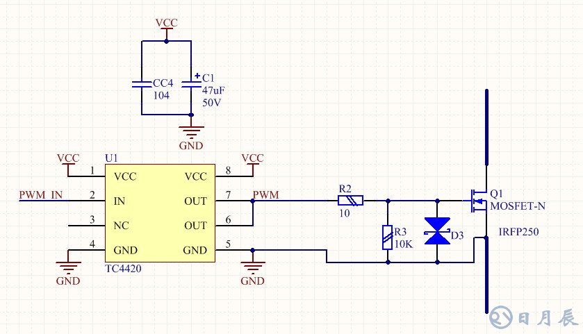 比較好的方法是使用專用的MOSFET驅(qū)動芯片如TC4420來驅(qū)動MOS管,這類的芯片一般有很大的瞬間輸出電流,而且還兼容TTL電平輸入