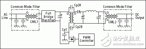 圖7. 在這個典型的離線式電源中,共模濾波器可降低輸入和輸出兩側的噪聲。