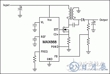 為了理解開關調節(jié)器中的噪聲源,必須首先了解其工作原理。對于各種類型開關調節(jié)器的描述超出了本文的涉及范圍。不過,基本上各種開關調節(jié)器都是利用有源元件(晶體管和二極管)在儲能元件(電感和電容)之間往復傳送電流,最終實現源端電壓/電流到負載端電壓/電流的轉換。為方便描述,采用MAX1653 DC/DC轉換控制器構成典型的同步整流、降壓型轉換器(圖1)。
