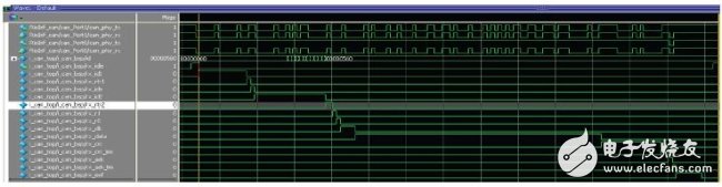 基于車電總線接口單元模塊對FlexRay接口狀態(tài)機制進行了驗證,利用ModelSim對邏輯設(shè)計進行仿真,其波形圖如圖14所示。