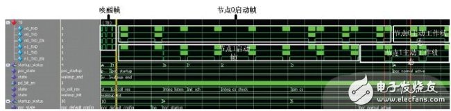 從仿真波形中可以清楚地看出FlexRay狀態(tài)機制的變化過程。當節(jié)點的收發(fā)器接收到喚醒特征符后,對主機處理器和通信控制器進行上電,喚醒并激活通信控制器、總線驅(qū)動器和總線監(jiān)控器。節(jié)點0被喚醒后,將返回喚醒完成信號,并處于等待啟動狀態(tài)。接著節(jié)點1收到喚醒信號,返回喚醒完成信號,節(jié)點1進入啟動狀態(tài),節(jié)點0也進入啟動狀態(tài),最終都進入主動工作狀態(tài),開始狀態(tài)機循環(huán),顯示FlexRay總線接口工作正常。