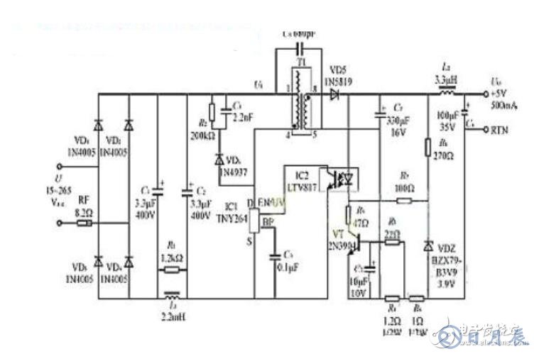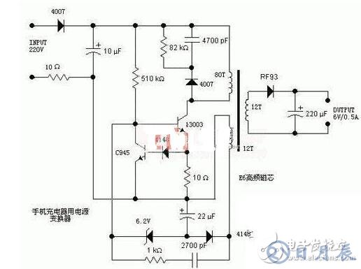 而下方的1KΩ電阻跟串聯(lián)的2700pF電容,則是正反饋支路,從取樣繞組中取出感應(yīng)電壓,加到開關(guān)管的基極上,以維持振蕩。右邊的次級(jí)繞組就沒有太多好說的了,經(jīng)二極管RF93整流,220uF電容濾波后輸出6V的電壓。沒找到二極管RF93的資料,估計(jì)是一個(gè)快速回復(fù)管,例如肖特基二極管等,因?yàn)?u style="color: rgb(51, 51, 51) !important;">開關(guān)電源的工作頻率較高,所以需要工作頻率的二極管。這里可以用常見的1N5816、1N5817等肖特基二極管代替。