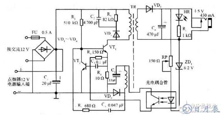 變壓器左下方的繞組(取樣繞組)的感應(yīng)電壓經(jīng)整流二極管4148整流,22uF電容濾波后形成取樣電壓。為了分析方便,我們?nèi)∪龢O管C945發(fā)射極一端為地。那么這取樣電壓就是負(fù)的(-4V左右),并且輸出電壓越高時(shí),采樣電壓越負(fù)。取樣電壓經(jīng)過6.2V穩(wěn)壓二極管后,加至開關(guān)管13003的基極。前面說了,當(dāng)輸出電壓越高時(shí),那么取樣電壓就越負(fù),當(dāng)負(fù)到一定程度后,6.2V穩(wěn)壓二極管被擊穿,從而將開關(guān)13003的基極電位拉低,這將導(dǎo)致開關(guān)管斷開或者推遲開關(guān)的導(dǎo)通,從而控制了能量輸入到變壓器中,也就控制了輸出電壓的升高,實(shí)現(xiàn)了穩(wěn)壓輸出的功能。