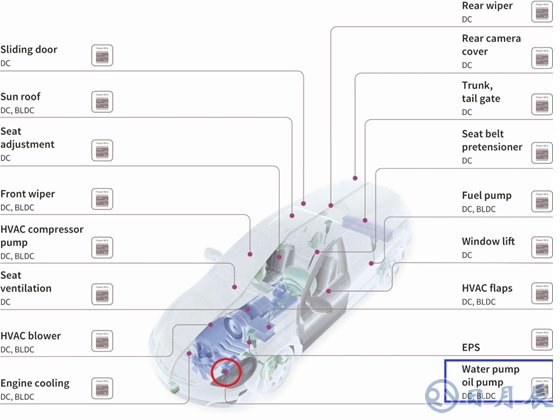 隨后汽車電子化程度的提升,自動駕駛及智能化的進展,電機在車中的應(yīng)用會越來越多,電機的類型和驅(qū)動也在發(fā)生著變化,傳統(tǒng)的機械驅(qū)動或者電機繼電器控制正在向 PWM(脈寬調(diào)制)調(diào)速和BLDC(無刷直流)電機控制方向轉(zhuǎn)變,尤其是在節(jié)能減排的這個大趨勢下,BLDC在汽車中將得到更廣泛的應(yīng)用,一個500W的散熱風(fēng)扇,繼電器控制改為BLDC可PWM調(diào)速方案, 可以節(jié)省大概1%的油耗;300W的水泵從機械方式改為電動驅(qū)動方式,可以減少 7.1g/km的二氧化碳排放;80W 的油泵從不可調(diào)速方案改為可調(diào)速方案,可以減少 1.9g CO2 /km的二氧化碳排放。