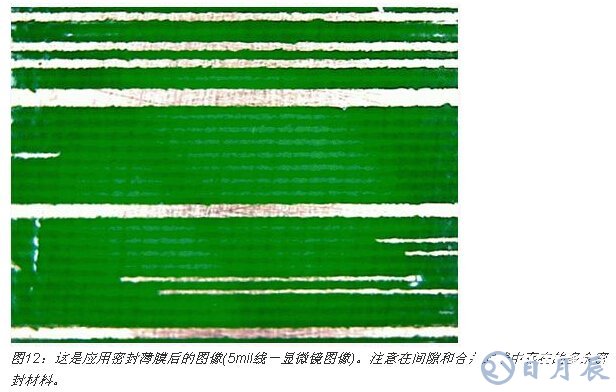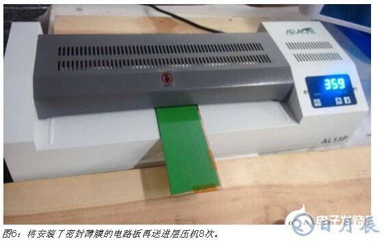 這種膜是綠色的,采用紙張形式。將膜切得比設(shè)計大半英寸左右。剝除有紋理一邊的保護膜(使用兩片透明膠帶將膜分開)。從一邊開始,使用復(fù)印滾筒將膜壓到電路板上。在滾筒壓接之前不要讓膜接觸電路板,防止產(chǎn)生氣泡。然后將層壓機加熱到200°F (93°C),將電路板送進層壓機。重復(fù)送板或更高的層壓溫度可能讓薄膜變得太軟,并致使它們回流,這似乎會產(chǎn)生氣泡和干斑。使用手指將膜壓入蝕刻槽也是個好主意。這種膜最好是在真空環(huán)境中進行層壓,因此這種方法不可避免會在膜的背后產(chǎn)生一些氣泡,特別是在又窄又細的槽里。如果有大的氣泡,薄膜很容易剝除并丟棄。