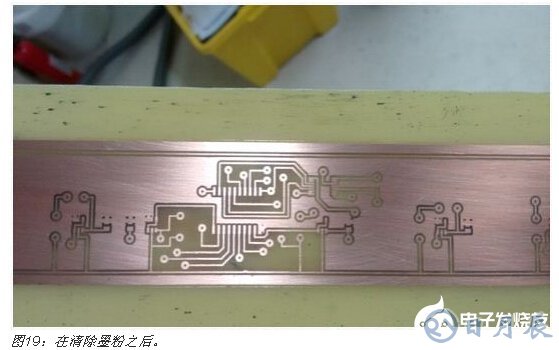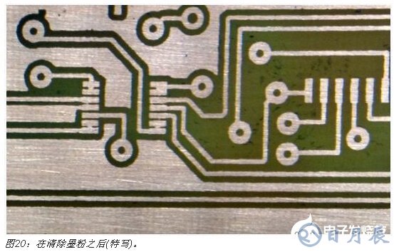 現(xiàn)在可以用丙酮等溶劑清除墨粉/密封材料了。但不要錯誤地使用浸過丙酮的毛巾去擦試電路板。這樣做將不可挽回地將墨粉弄進電路板,使電路板非常難看。相反,要將整塊電路板浸到丙酮桶中,等待2至3分鐘的時間使之滲透到墨粉中,在仍浸潤于丙酮之時,使用軟鬃毛刷子將墨粉脫離電路板。在將所有墨粉完全從電路板分離之前,不要將電路板從丙酮液中拿出來。有些墨粉可能仍然粘在電路板上,但這似乎是無法避免的。
