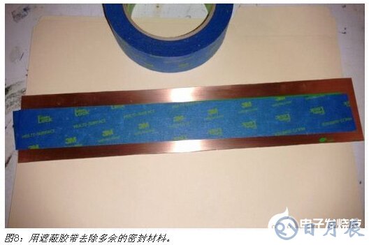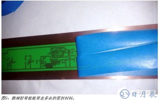 買一卷3M的潔凈遮蔽膠帶,將它粘貼到電路板的兩個整表面。用一個復(fù)印滾筒或有力的指壓將它牢牢粘貼到走線中。然后將膠帶撕掉。這樣就能去除不在原始碳粉表面的所有多余密封材料。這一步也會讓你相信,碳粉和密封材料非常牢固,不是那么容易就能擦除掉。