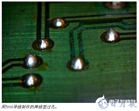 焊線是連接過孔的最簡單方法,但它會留下像大橡樹果一樣的突起物,即使用平頭鋼絲鉗剪過。這些接點不僅難看,而且在這些過孔上方不能再放置元件。然而這是目前最為簡單的過孔制作方法。