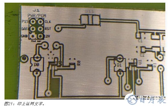 這一步是將一些標記和文字印到電路板上,不過不是用傳統(tǒng)的絲網(wǎng)印刷方法,而是用同樣的墨粉轉(zhuǎn)印技術(shù),利用以前鉆好的對齊標記將圖案打印到電路板上。因為在經(jīng)過銅蝕刻后表面不是完全平坦,位于銅箔邊緣的一些圖案將無法正確轉(zhuǎn)印。為了盡量減少問題,設(shè)計應(yīng)盡可能避免跨越蝕刻區(qū)的邊界。