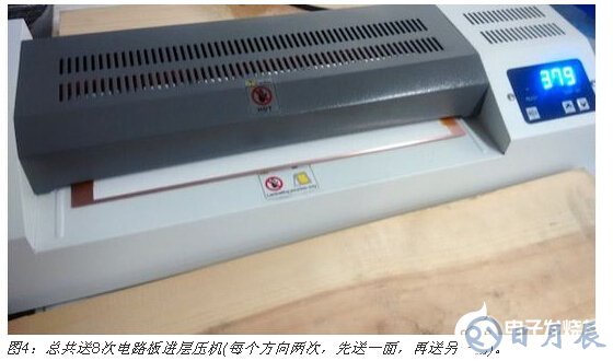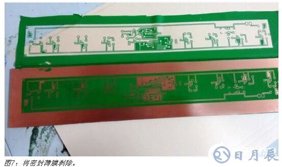 將層壓機開機,經(jīng)過大約15分鐘后達到全熱狀態(tài)。然后從全部4個邊的方向送板子進去。我們不能認為頂面和底面會同等加熱,因此最好將板子翻過來,再送4次。也就是說總共送8次進層壓機。結(jié)束后在空氣中冷卻一會兒,再朝紙上噴一些水。脫模劑應(yīng)變得具有活性,不用費力那些紙就能自己分開來。然后將膠帶小心的撕下來,將紙丟掉。將電路板放在干凈的自來水中沖幾分鐘。這一步很重要。我們必須徹底清除粘在碳粉轉(zhuǎn)印紙上的脫模劑,否則它會影響下一步密封材料的粘貼。