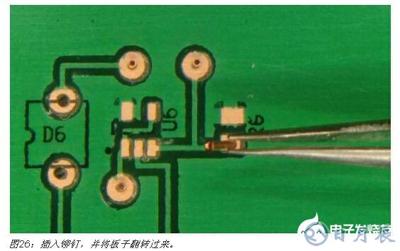 空心鉚釘是一種更加整潔的可選方法。我曾用過0.6mm的銅質(zhì)鉚釘(0.4mm內(nèi)徑),它們可以在易趣和各種其它資源上獲得。還要一個用于按壓這些鉚釘?shù)膶S霉ぞ?,但極其昂貴,我無法想象有人真的買過這樣的工具。鉚釘可以手工安裝。在版圖上我設(shè)計了75mil的焊盤,鉆孔孔徑是25mil。用#72鉆頭打孔,再用鑷子插入鉚釘。將電路板反過來,放在金屬平面上,確保鉚釘與金屬板接觸。在放大鏡下用圖釘輕輕地撐開鉚釘尾部。然后使用內(nèi)六角螺絲刀等工具的平頭按壓尾部,確保螺絲刀垂直于電路板。當鉚釘?shù)轿粫r按壓應(yīng)發(fā)出一個明顯的咯嗒聲。這不會用多大的力,因為銅是軟的。