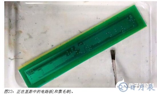 將電路板浸入顯影劑溶液中,用鬃毛刷輕輕地刷洗。規(guī)范要求溶液加熱到90°F (32°C),但那樣做似乎顯影速度太快了。當溶液溫度較低時更好控制,只需花大約5分鐘的時間就能完成顯影。過長的顯影時間會使得膜變得太軟,并且邊緣參差不齊,因此仔細監(jiān)視整個過程很重要。
