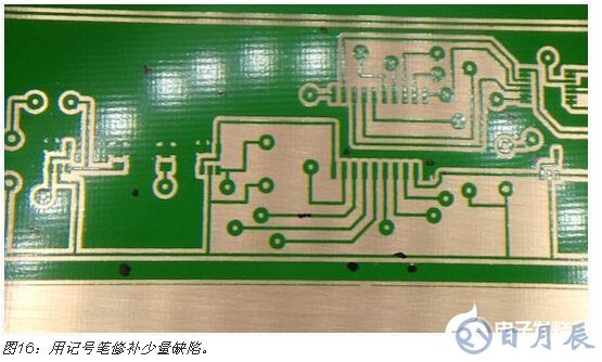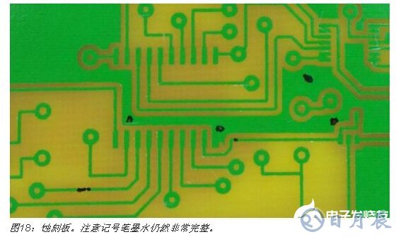 接下來要仔細檢查走線中是否有任何斷點和針孔。這些斷點和針孔很容易用精細的記號筆加以修繕。記號筆的墨水似乎與蝕刻劑結(jié)合得非常好。