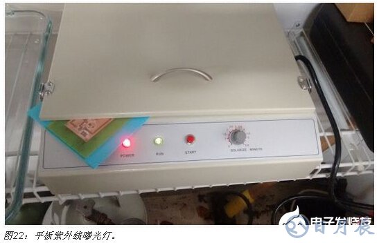 現(xiàn)在萬事俱備,可以用紫外光照射阻焊層了。這時需要一個紫外燈。對于小板子來說,美甲燈就行了,價格是20美元。對于大板子而言,需要一個平板型的紫外線燈,價格大約75美元。平板燈之所以好,是因為蓋板有個鎖止裝置,可以將幻燈片壓在電路板上,提高圖像的分辨率。