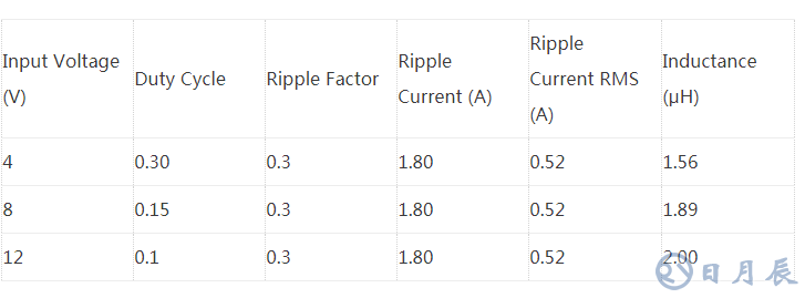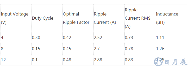 Vin = 4 ~ 12V, Vout = 1.8V, Io = 6A, ΔVo = 10mV (輸出電容上的紋波電壓)。設計中假設功率開關和續(xù)流二極管都是理想的,表1 顯示了用傳統(tǒng)方法按照 30% 紋波系數(shù)計算出的電感量,而按照本文提案的面積積方法得出的經過優(yōu)化的計算結果在表2 中列出。