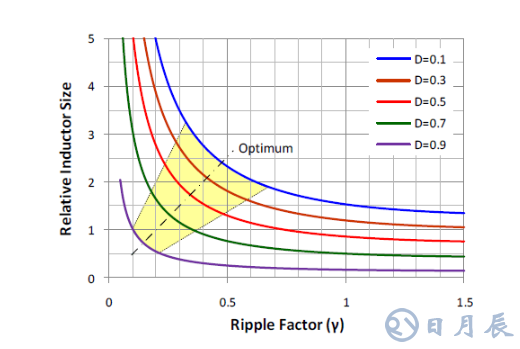 圖3. 不同占空比下紋波系數(shù)和電感尺寸之間的關系